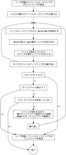 一応 select(2) も読んであったので説明しとく。メインループは非常に短いので抜粋。ここにはビットマップの転送処理は含まれていないので注意。max_select_fd() の前後が rcu_read_lock() と rcu_read_unlock() で囲まれているのは、ドキュメント (Document…